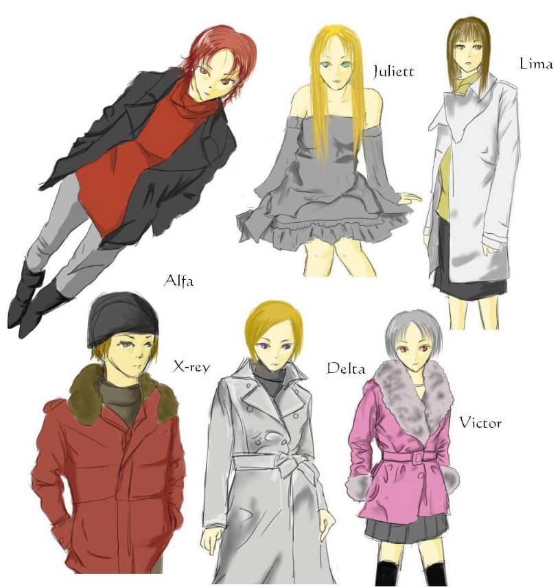 例えば、舞台は11月なのでみんなコートを着てるし、Xは初期設定ではニット帽にジャージを着ている事になってたけど、絵にしてみるとジャージはバランスが悪い。っていうことでダウンジャケットを着させています。